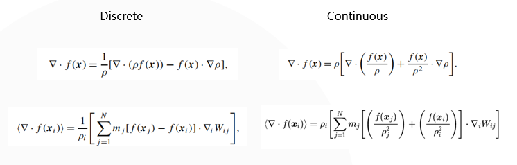 The main reason for the popularity of SPH in fluid simulation is that it support the differential on particles easily and the differential of the kernel function can be convert to the differential of the SPH kernel, which is easy and fixed. We will show the conversion for some differential operators below: